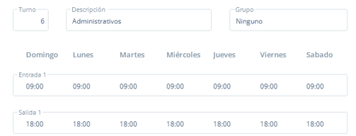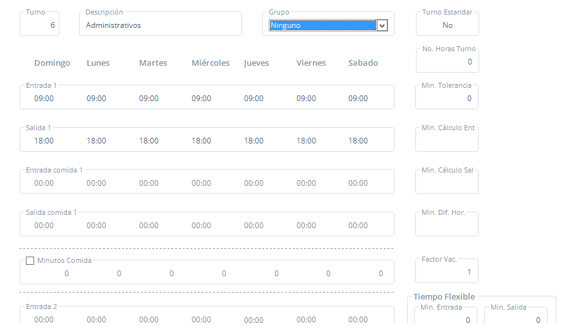 Para nuestro ejemplo crearemos el turno 6 Administrativos, con horarios laboral de 9 a 18 horas y descansos en sábado y domingo.