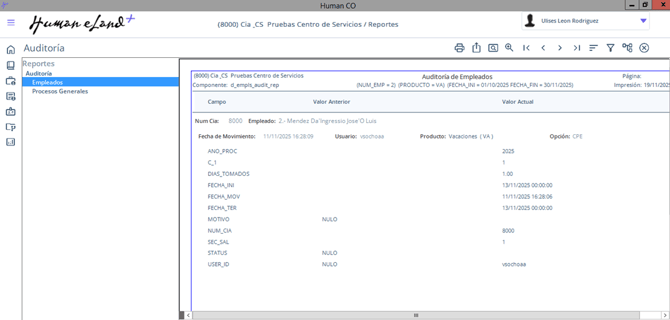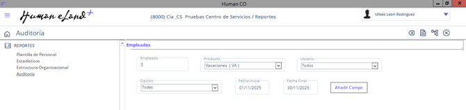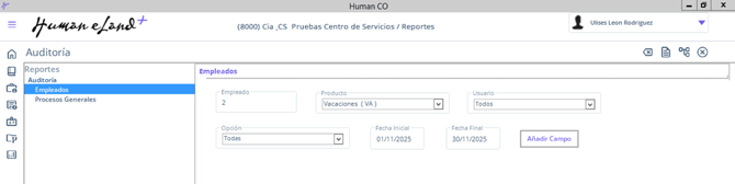 Ruta: Human Core / Reportes / Auditoría / Empleados