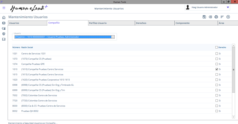 - Marca el recuadro con la compañía que acabas de crear para dar el derecho al usuario para poder ingresar.