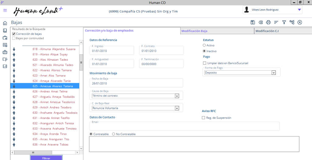 - Seleccionar opción Corrección de baja.