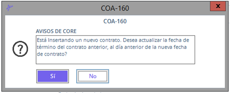Haz clic en el botón SI con eso automáticamente se actualizará la fecha de terminación del contrato vigente, posteriormente ya podrás captura el movimiento de contrato con la fecha que deseas.