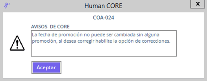 El mensaje se debe a que se está aplicando un cambio en la fecha Promoción del empleado sin realizar un cambio en los campos del apartado de Promoción.