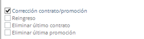 - Activar la casilla “Corrección de Contrato Promoción”. Esta acción le permitirá sobre escribir la fecha conservando todos los datos correspondientes del recuadro Promoción.