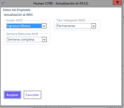 - En la parte superior de la pantalla haz clic en el primer botón de izquierda a derecha “Guardar”, esta acción lanzará el recuadro de Actualización al I.M.S.S.
