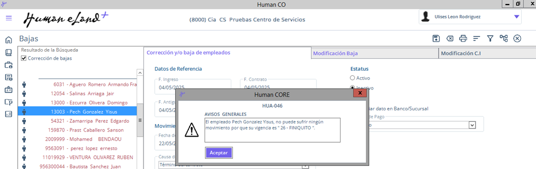 - Posteriormente te mostrar un mensaje indicando que el empleado no puede sufrir cambios, por ter vigencia 26 “Finiquito” debes dar clic en el botón “Aceptar”.