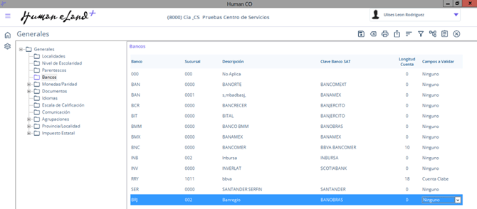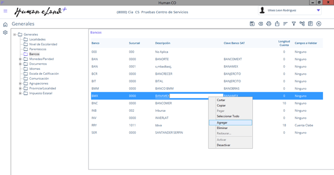 Ruta: Human Core / Flecha abajo parte superior derecha /Parámetros / Generales/ Bancos
