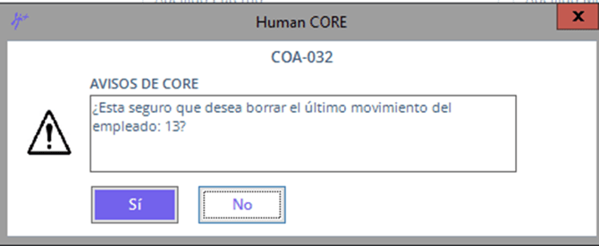 - Se mostrará el mensaje “COA-032”, haz clic en el botón “Si” para continuar la eliminación o “No” para cancelar.
