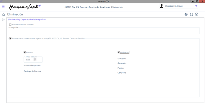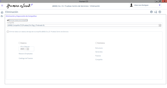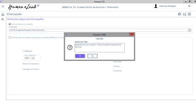 - Selecciona la compañía a eliminar en el campo Compañía.
