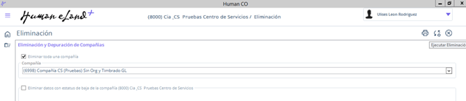 - Una vez seleccionada la compañía en el campo desplegable, dar clic en el botón Ejecutar Eliminación.