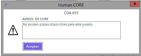 Human CORE - Mensaje COA-015, No existen plazas disponibles para este puesto.