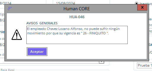 El mensaje HUA - 046 se muestra al tratar de actualizar algún dato de un empleado dado de baja y tiene un finiquito aplicado.