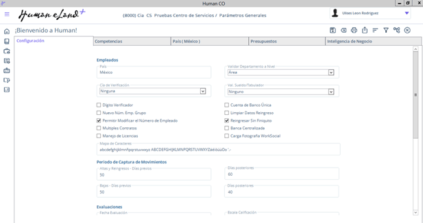 Ruta: Human CORE /Flecha abajo parte superior derecha / Opciones Generales