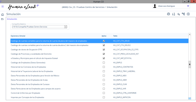 - En la sección de Opciones a Simular, marca solo lo referente a parámetros (Catálogos), es decir excluye todo lo referente a HU_EMPLS.