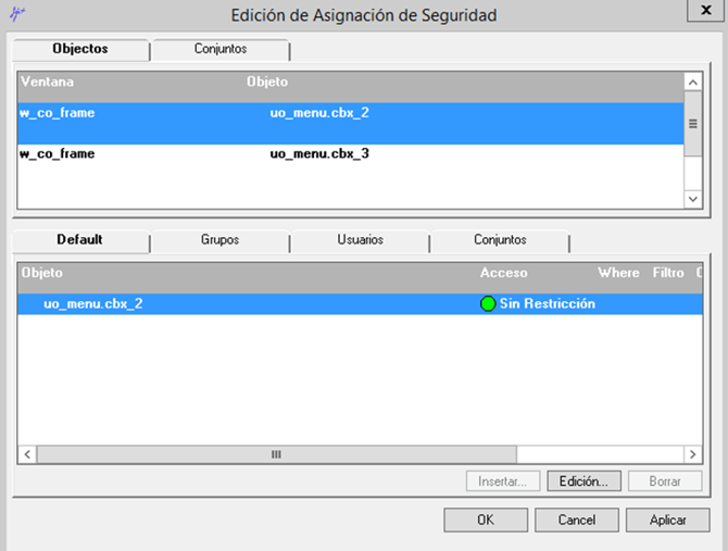 Usaremos la pestaña “Default” de la sección inferior de la ventana “Edición de Asignación de Seguridad”, sin embargo, es posible utilizar las pestañas “Grupos” y “Usuarios.
