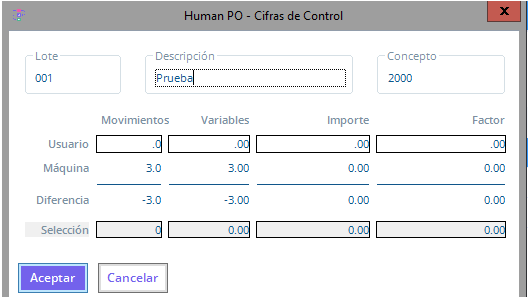 - Selecciona el proceso que estas calculando, selecciona el lote y haz clic en el botón Cifras de control, y revisa que los datos se centren correctos, haz clic en el botón Aceptar para guardar los cambios efectuados.