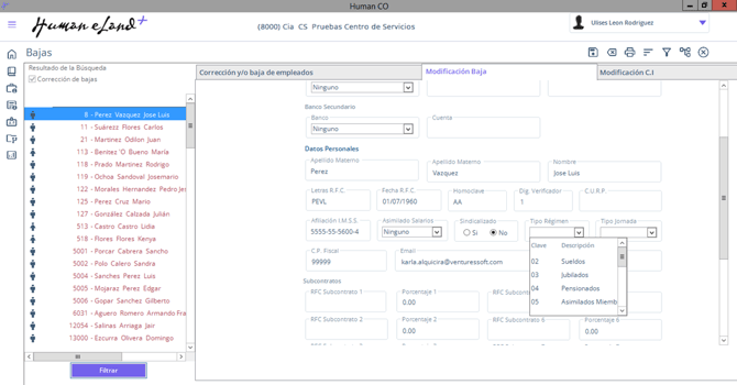 - Pestaña Modificación Baja / Sección Datos Personales / Campo Tipo Régimen.