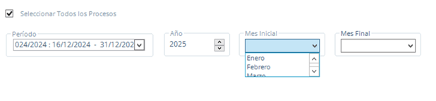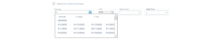 Nota: Al seleccionar la casilla Todos, de manera automática habilita Mes y Año y deshabilita Periodo, tener en cuenta que los datos que toma para el reporte son de la nómina acumulada.