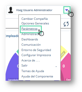 - Una vez que hayas ingresado a Human Procesos desde Human WorkSocial, identifica el recuadro en la esquina superior derecha en donde se muestra el nombre de usuario y haz clic en el icono de Opciones. Se desplegará una lista de opciones, deberás hacer clic en la opción Parámetros.