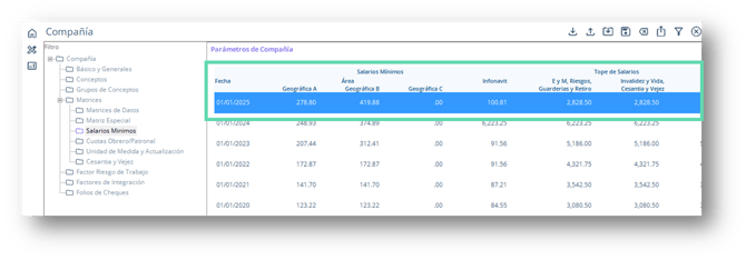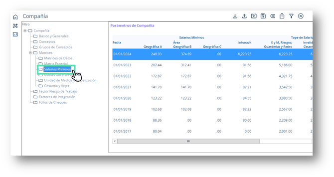 - Haz clic sobre la carpeta Salarios Mínimos. En el lado derecho de la pantalla, se desplegará el detalle de la matriz de salarios mínimos con los valores de cada año que se hayan registrado.