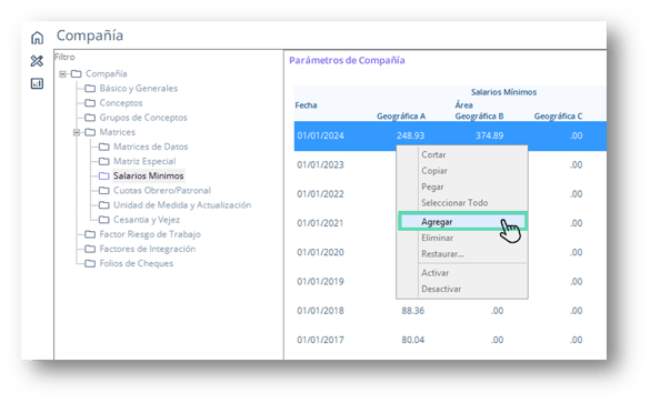 - Haz clic derecho en cualquier espacio de la matriz de salarios y selecciona la opción Agregar.