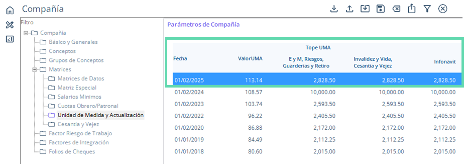 - Haz clic sobre la carpeta Unidad de Medida y Actualización. En el lado derecho de la pantalla, se desplegará el detalle de la matriz con los valores de cada año que se hayan registrado.