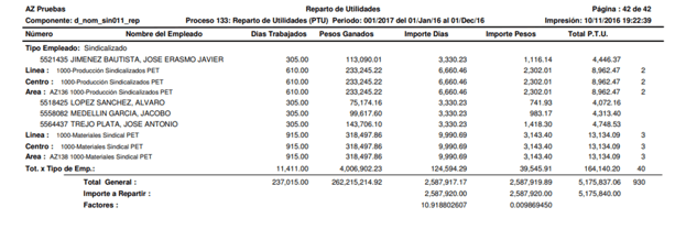 Te generará un reporte con la información de monto a repartir por empleado Días y Pesos. Al final de reporte muestra los factores por cada rubro.