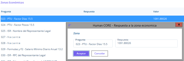 7. Haz clic en la Zona Económica, los factores se captura dependiendo de la configuración de la política de calculo de PTU, es decir, si la política del concepto 363 PTU a Repartir Sin Topes, divide el factor entre 100, entonces debes multiplicar por 100 el factor del reporte y capturar el resultado en las preguntas de Zonas Ecónoma.