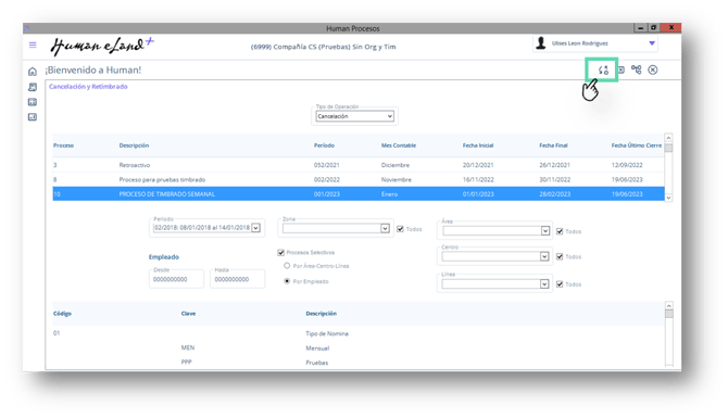 10. Mostrara una pantalla, dar clic en el botón buscar, enlistara a los empleados que fueron timbrados en el proceso y periodo, selecciona el empleado o los empleados, que requiera cancelar y dar clic en el botón aceptar.