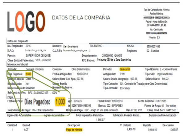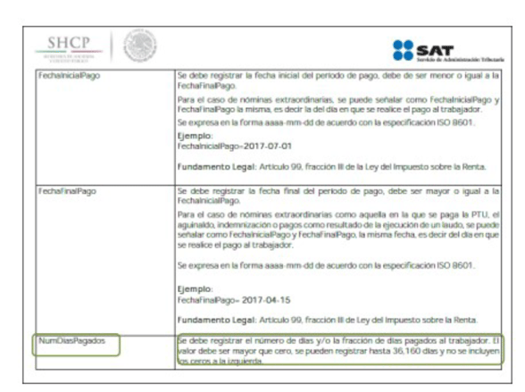 El Valor Descriptivo en CFDI del campo "Días Pagados" es uno de los requerimientos del SAT por lo que en la guía de llenado del comprobante del recibo de pago de nómina y su complemento podemos localizar: