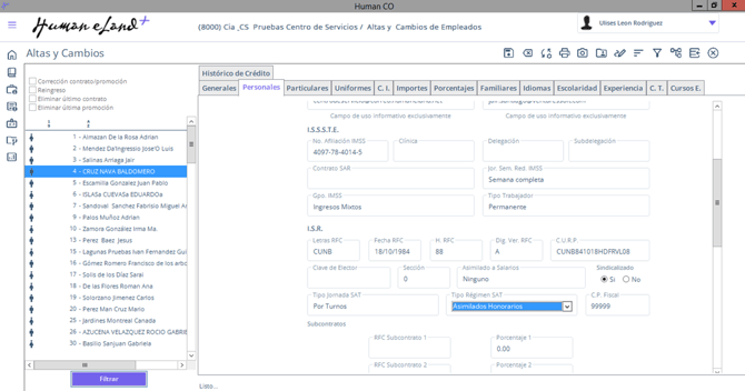 - Busca al empleado y consulta la pestaña Personales / Tipo régimen SAT.