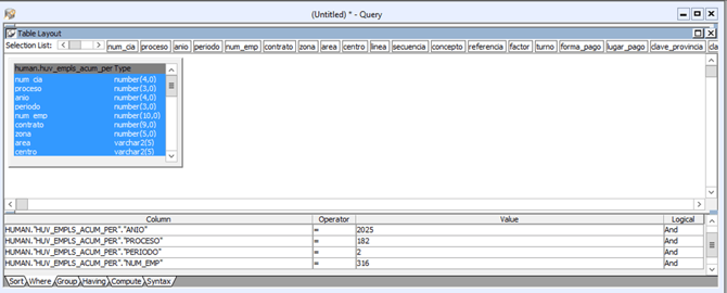 - Busca la tabla human.huv_empls_acum_per.