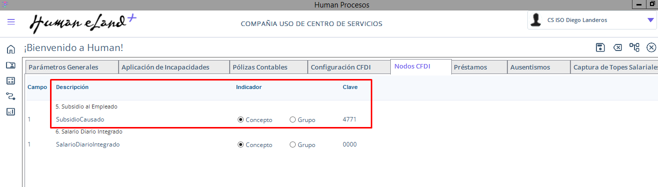 Desde Human Procesos / Flecha abajo de la parte superior derecha / Opciones Generales / Nodos CFDI