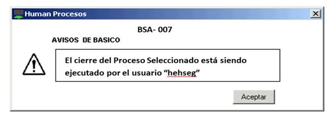 El mensaje BSA– 007 Se muestra al tratar de realizar el cierre de un proceso y este fue ejecutado por otro usuario. El mensaje muestra el nombre del usuario que está ejecutando el cierre de la nómina.