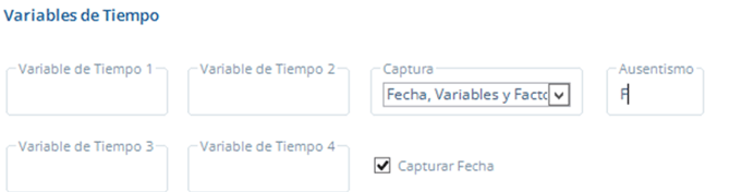 - Variables de Tiempo: Si requieres capturar variable de tiempo debes ingresar al menos un carácter en el campo de la variable. Debe ser al menos un número, una letra (mayúscula o minúscula), o un símbolo, con un máximo de cuatro caracteres, preferentemente con referencia al dato de la variable. Por ejemplo: