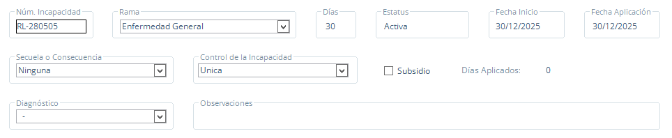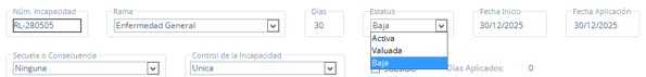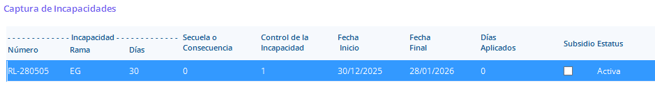 En la parte superior derecha de la pantalla, se enlistaran las incapacidades que tiene capturadas el empleado.