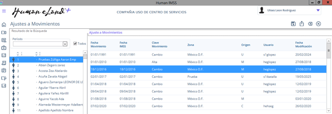 2. Seleccionar empleado, de lado izquierda de la pantalla, se enlistara los movimientos cronológicamente.