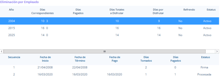 2. Se mostrar la información por año de los derechos de vacaciones, haz doble clic sobre el año a eliminar, te mostrar en la parte inferior las secuencias de salida de vacaciones, que depende del año seleccionado.