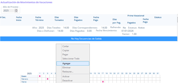 4. Haz clic derecho y selecciona la opción agregar, o bien si ya tienes una secuencia de salida de vacaciones haz doblé clic sobre ella.