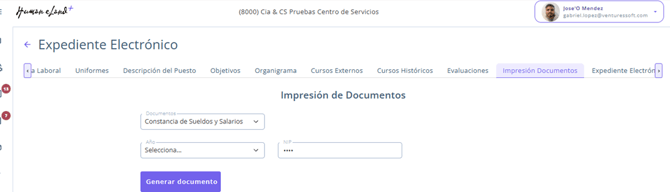 - En la pestaña Impresión de Documentos, en el campo Documentos, desplegar la lista y seleccionar Constancia de Sueldos y Salarios.